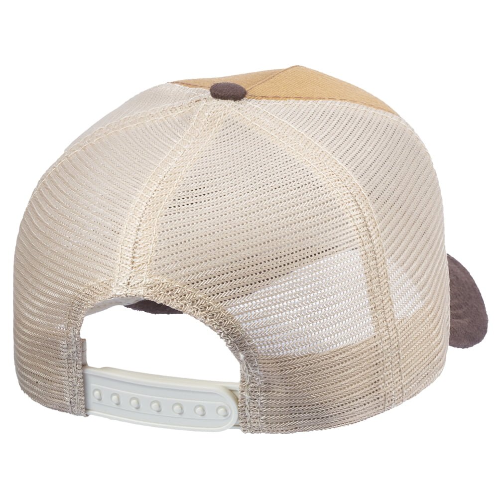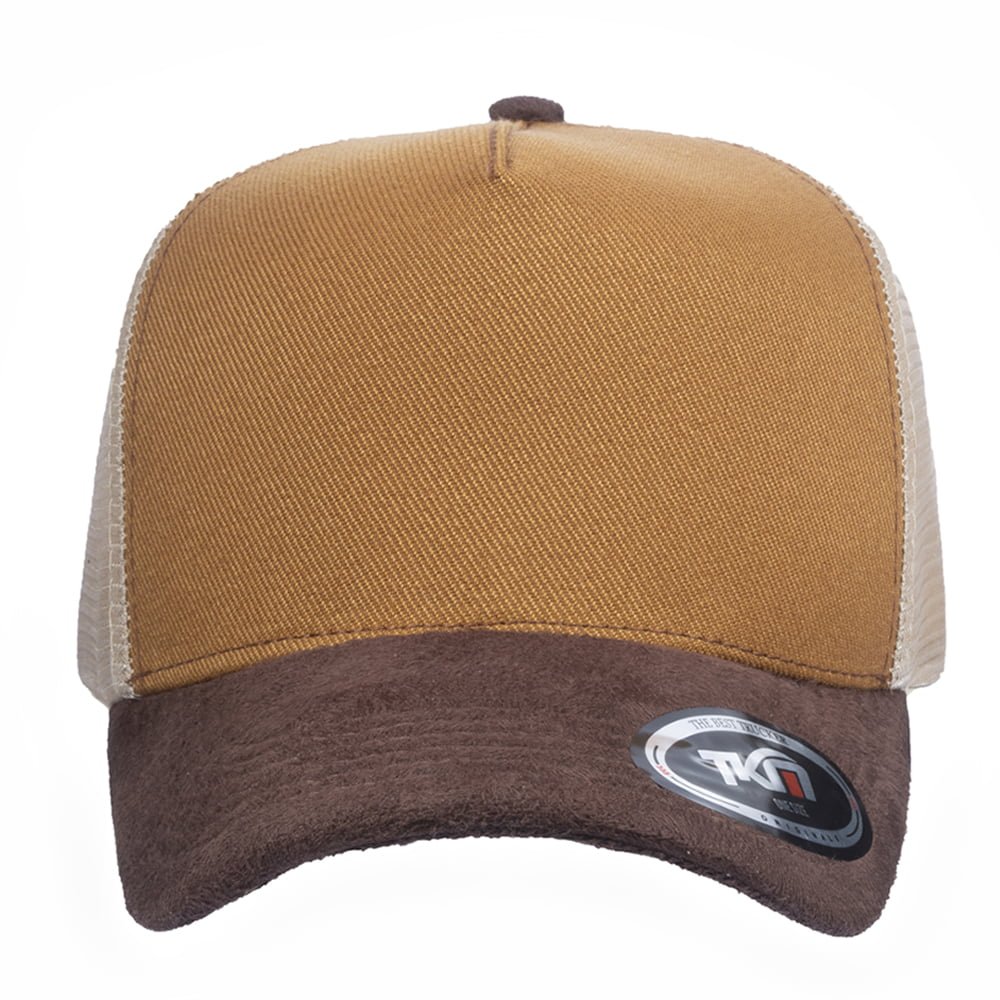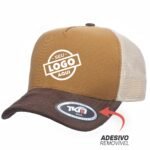 Boné modelo Trucker, confeccionado em tecido Sarja 100% Poliéster e frente dublada com entretela de memória.